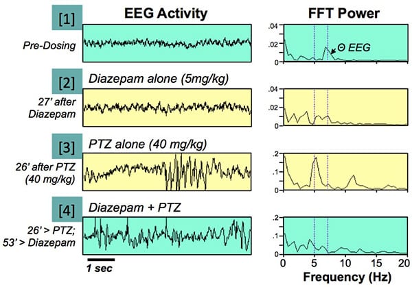 For example, quantitative anti-convulsant activity can be evaluated using sub-convulsant doses of pentylenetetrazole (PTZ) that produce characteristic EEG frequency changes that can be quantitatively analyzed for several hours.