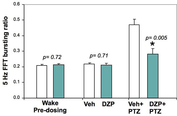 Bursting induced by PTZ was quantified by frequency analysis, and the effect of Diazepam evaluated. Graph above shows significant effect of Diazepam (5 mg/kg) in suppressing PTZ-induced bursting (paradigm as in Figure 1; N= 5 / group). This paradigm potentially allows repeat testing of animals to determine the effects of chronic or sub-chronic administration of PTZ or anti-convulsant drug. *p<0.005.