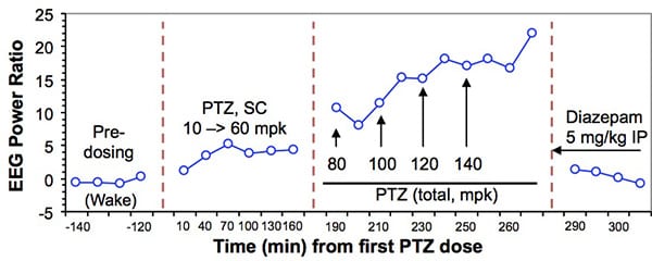Bursting can be induced in mice by dose-escalation of PTZ. The graph above shows the increase in EEG power at 4-6 Hz over a period of 280 min during successive administration of PTZ doses totaling 140 mg/kg. Diazepam (5 mg/kg) was then administered and within minutes suppressed the bursting.