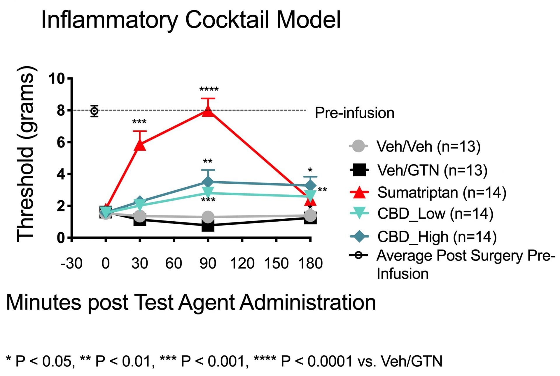 After the 5d inflammatory soup sensitization period, rats had a one-week wash-out period and were then challenged with 0.1mg/kg glyceryl trinitrate (GTN), followed by sumatriptan, vehicle, or Viridian’s proprietary formulation of CBD, with at least a one-week washout between each treatment. The design was within-subjects with the same animals receiving multiple treatments in a crossover fashion. A blinded investigator tested periorbital sensitivity using von Frey filaments with reproducible calibrated buckling forces varying from 0.4 – 10 g utilizing the simplified up-and-down method before drug administration and 30min, 1.5hrs, and at 2.5hrs after drug administration.  A positive response was characterized by several behavioral criteria: stroking the face with a forepaw, head withdrawal from the stimulus, and head shaking.