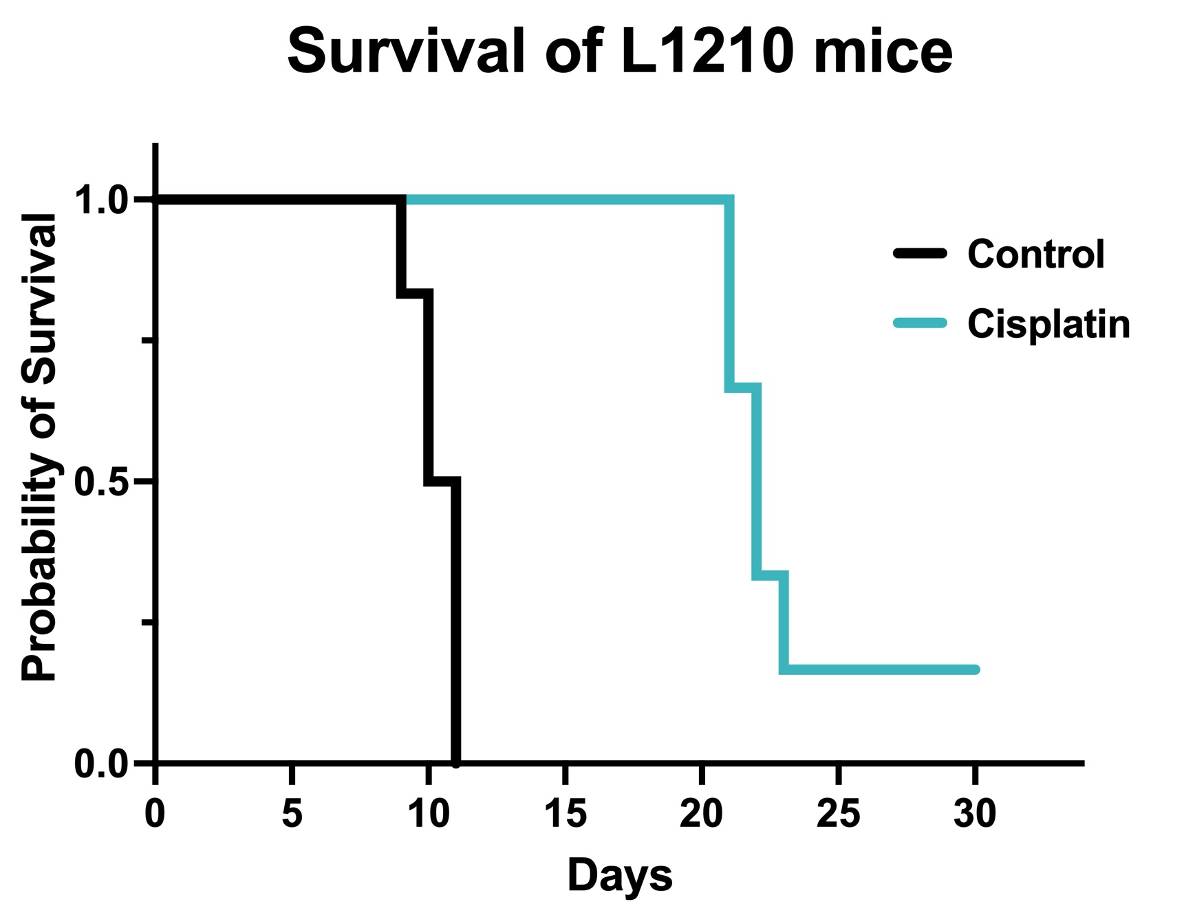 Figure 1. Chemotherapy validation in L1210 syngeneic model. 1 x106 L1210 cells were intraperitoneally injected into DBA/2 mice. The mice were randomized with body weight and the treatment was initiated 2 days after cell injection. Survival was monitored daily thereafter. Cisplatin was administered at 3 mg/kg by IP weekly for 3 weeks. Data are survival proportions from starting group size (N=6) Cisplatin significantly increased survival compared to vehicle controls. p=0.001 by Mantel-Cox Log-rank test.